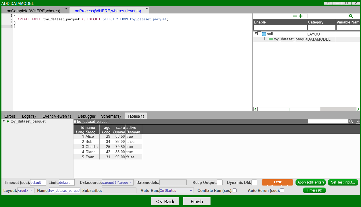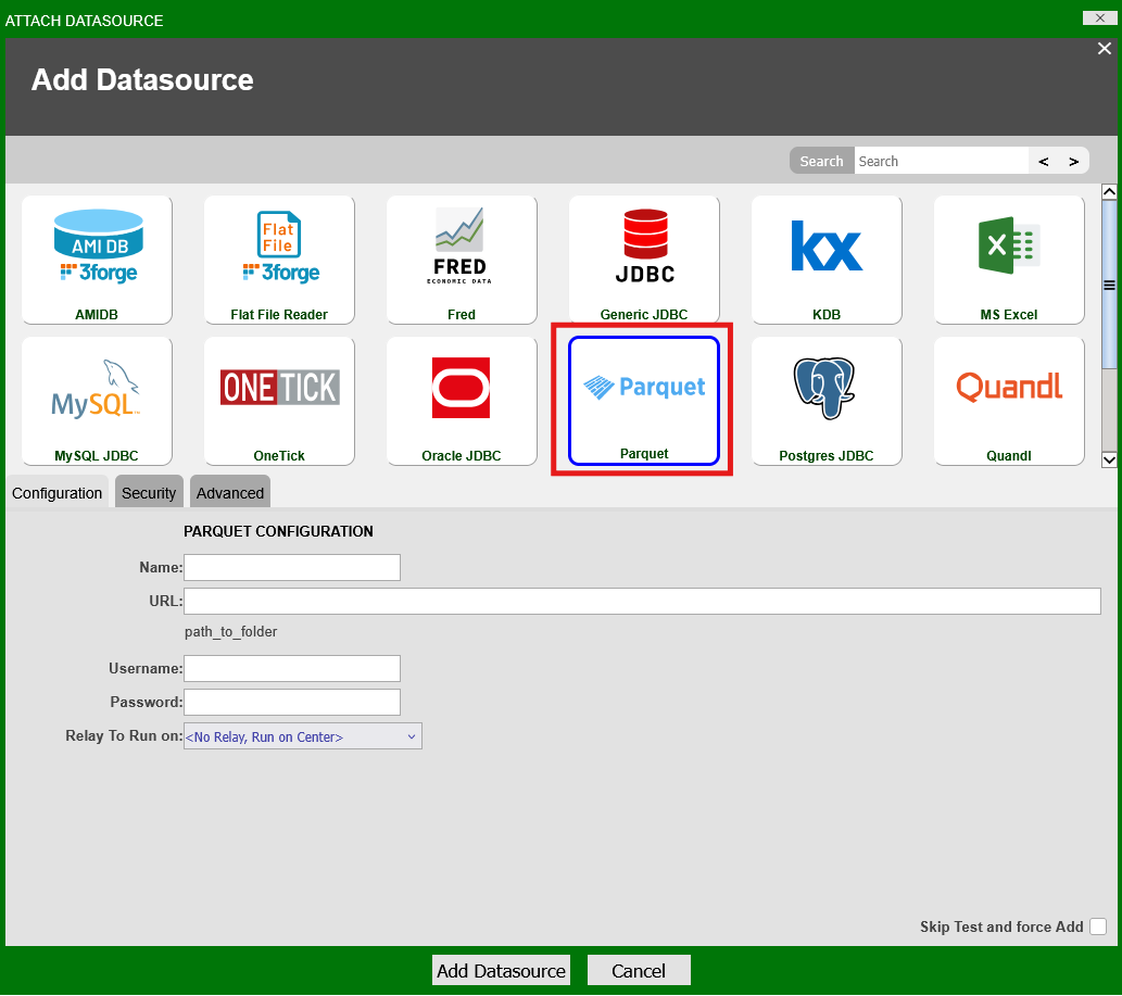 .parquetfiles. Click "Add Datasource." -
