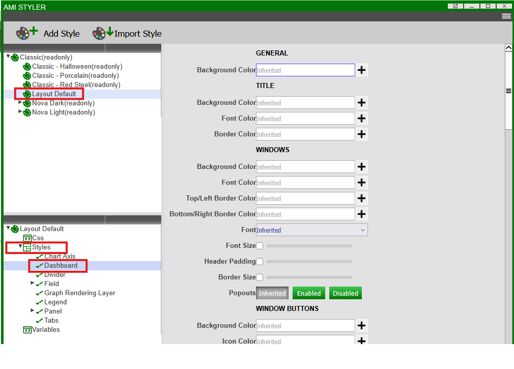 Finally, under "Layout Default", select CopiedStyle to inherit from. This will update the style of the entire dashboard to this style.
