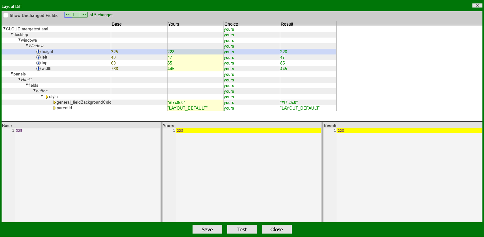 The very top of the tool shows the number of changes (5). It is green to indicate that there are no conflicting changes. The navigation arrows can be used to go through each change in the layout line-by-line.